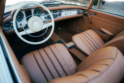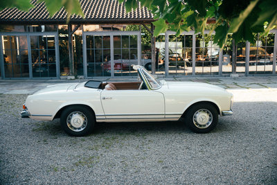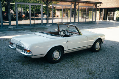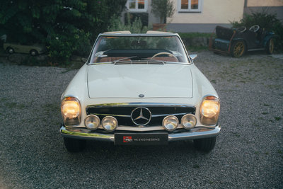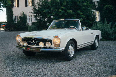 NEU eingetroffen: Highlights: • deutsches Fahrzeug mit lückenloser Besitzerhistorie, Hardtop, Radio Becker Europa, Windschott, und ganz seltenem ZF 5-Gang Getriebe ab Werk • vermutlich wurden ab Werk nur weniger wie fünfhundert Mercedes-Benz 280 SL Pagoden mit ZF 5-Gang Getriebe ausgestattet • erstmalig ausgeliefert am 21. März 1969 in der heutigen Farbkombination weiß 050 kombiniert mit einer cognacfarbenen Lederausstattung sowie einem blauen Softtop • nur 4 Vorbesitzer und seit 1982 im Familienbesitz • originaler Kraftfahrzeugbrief (Pappbrief) & Fahrzeugbrief vorhanden • laut vorliegender Rechnungsdokumentation wurde im Jahr 2012 die Innenausstattung erneuert • inklusive Mercedes-Benz Datenkarte, vorliegender Kurzbewertung, originaler Betriebsanleitung, altem Fahrzeugbild aus 1983 • die Übergabe erfolgt im aktuellen Zustand mit fälligen Servicearbeiten und mit gültiger Hauptuntersuchung bis August 2026 Der Verkauf erfolgt von privat im Kundenauftrag. Zwischenverkauf und Irrtümer für dieses Angebot sind ausdrücklich vorbehalten. Ausschlaggebend sind einzig und allein die Vereinbarungen im Kaufvertrag.