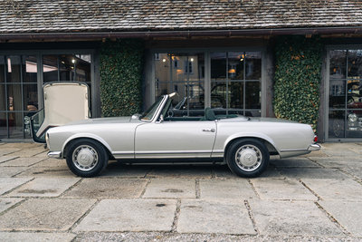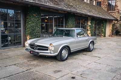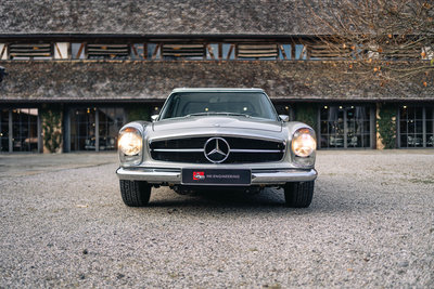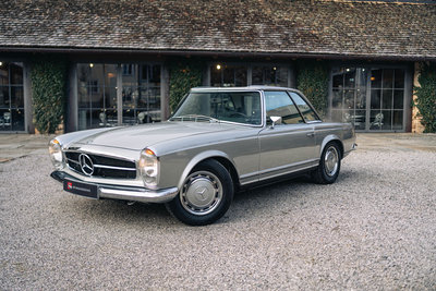 HIGHLIGHTS: • Mercedes-Benz 280 SL „Pagode“ aus dem Jahr 1968 mit Automatikgetriebe • Zeitlos elegante Farbkombination in Silbergrau-Metallic mit dunkelgrünem Interieur und grünem Softtop • Perfekte Vollrestauration durch den deutschen Experten Stickel Pagoden Center aus Rutesheim • Laut Mercedes-Benz Herstellerbescheinigung „Matching Numbers“ • Sonderausstattung: Radio Becker Mexico mit Navigation, V2A-Auspuff, Lederausstattung grün, Kopfstützen, Dreipunkt-Automatikgurte, Notsitze, Colorverglasung, Antenne elektrisch, Wegfahrsperre, Zusatzlüfter elektrisch, Hardtop restauriert, GPS, Diebstahlwarnanlage, Automatik-Getriebe, Servo-Lenkung, Sportfahrwerk Diese Mercedes-Benz 280 SL Pagode aus dem Baujahr 1968 präsentiert sich in der klassischen und äußerst stimmigen Farbkombination Silbergrau Metallic (Farbcode 180) mit grünem Lederinterieur. Das dunkelgrüne Verdeck sowie das silbermetallic lackierte Hardtop runden das elegante Gesamtbild harmonisch ab. Das Fahrzeug wurde ursprünglich in den USA ausgeliefert und im Jahr 2012 nach Deutschland importiert. Von Oktober 2013 bis März 2015 erfolgte eine umfassende Vollrestauration durch das renommierte Stickel Pagoden Center. Sämtliche Arbeiten wurden mit höchstem handwerklichem Anspruch und großer Sorgfalt ausgeführt und sind durch über 300 Restaurierungsfotos lückenlos dokumentiert. Seit Abschluss der Restauration befindet sich der Wagen durchgehend im selben Besitz. Der 280 SL verfügt über „Matching Numbers“, bestätigt durch ein Originalitätszertifikat von Mercedes-Benz, sowie über eine Classic-Data-Bewertung mit der Zustandsnote 1. Die ursprünglich vorhandene US-Spezifikation wurde fachgerecht auf deutsche Auslieferungsspezifikation umgerüstet. Der Kilometerstand seit der Vollrestauration beträgt 12.980 km, das Fahrzeug ist mit einem H-Kennzeichen zugelassen. Im Fahrbetrieb überzeugt die Pagode durch sehr ausgewogene und souveräne Fahreigenschaften, eine harmonisch arbeitende Automatik sowie ein authentisches klassisches Mercedes-Benz-Fahrgefühl ohne Kompromisse. Zwischenverkauf und Irrtümer für dieses Angebot sind ausdrücklich vorbehalten. Ausschlaggebend sind einzig und allein die Vereinbarungen im Kaufvertrag.