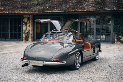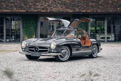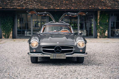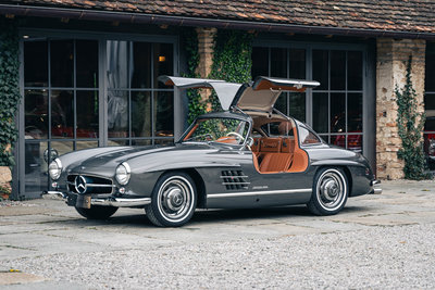 HIGHLIGHTS: • Beautiful, perfectly restored 1956 Mercedes-Benz 300 SL Coupé in anthracite gray with elegant cognac leather interior • Completely restored by HK-ENGINEERING between 2021 and 2023, with only 1,700 kilometers driven since then • Restoration work costing over €580,000, including repainting on bare metal in anthracite gray, new cognac leather interior, and a complete technical overhaul • Part of the renowned James Leak Collection (USA), only six documented previous owners in total • First delivered on September 5, 1956, via Mercedes-Benz New York in fire engine red (DB 534) with black leather interior (953) • According to data card, with extensive special equipment, including: special upholstery, instruments with English lettering, sealed beam headlights with separate parking lights, bumper horns, protractor and loose balancing weights supplied, disc wheels with chrome-plated bowl and highly polished rim, windshield washer system, and 1 kg paint reserve • According to Mercedes-Benz data card with coveted "matching numbers"